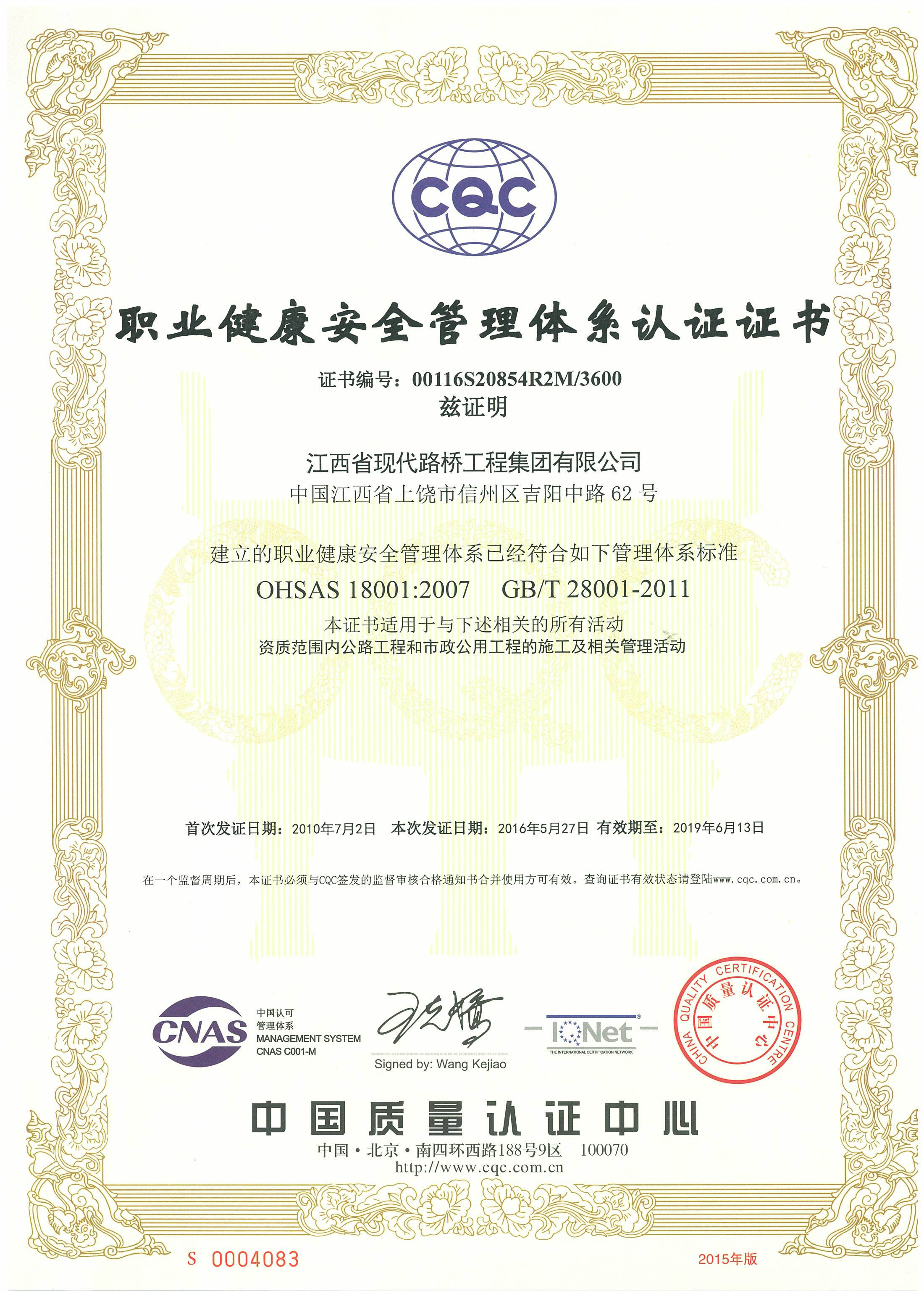职业健康安全管理认证证书